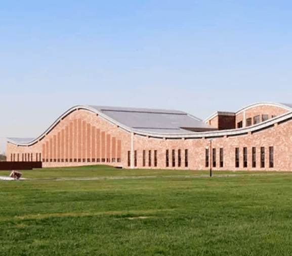 建筑基地北有石碑河,南有新石碑河兩條河流。建筑造型從所處環(huán)境出發(fā),以流動(dòng)的水作為媒體,這樣兩條舞動(dòng)的絲帶呼應(yīng)兩條河流成為建筑形象首選。如絲帶般飄逸的金屬屋頂弧線自然流暢,中間用內(nèi)庭院隔開,絲帶南北兩側(cè)呈對(duì)稱式布置。南北立面形象彼此呼應(yīng),完美互補(bǔ)。