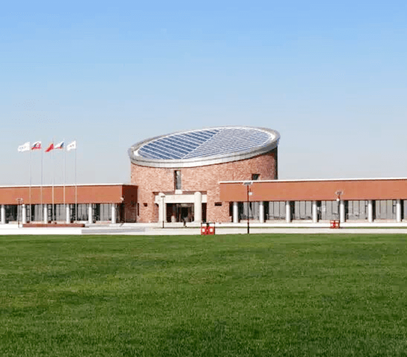 建筑中心的圓形來源于提煉的橡木桶的造型,它不僅僅作為藏酒器具,更被視為葡萄酒界身份和品位的象征。其是一種藝術(shù),一種文化,它已超越了其本身的意義。屋頂?shù)牟A粔⒆匀还饩€瀉入與建筑內(nèi)部相互融合。兩翼采用水平帶狀的幾何體與圓形主體之間形成對(duì)比,凸顯整個(gè)建筑的沉穩(wěn)大氣,尤其18根直徑0.9米圓柱更是將建筑的沉穩(wěn)達(dá)到極致,給游客帶來感官新體驗(yàn)。落地窗的采用使立面虛實(shí)結(jié)合,同時(shí)與建筑南側(cè)的噴泉水池相互借景,你中有我,我中有你,交相輝映。