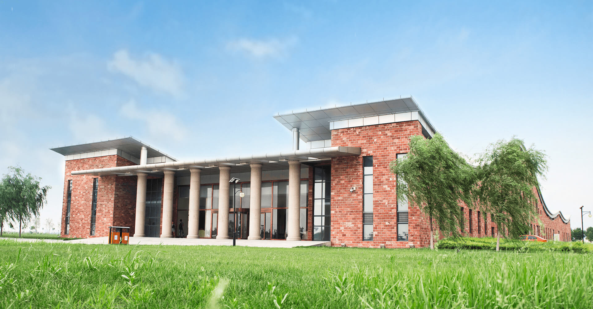 建筑立面深紅色花崗巖與光面磚相結(jié)合,營(yíng)造流動(dòng)的音樂符號(hào)形象。東立面作為廣場(chǎng)入口主里面注重空間層次多重化。細(xì)長(zhǎng)的圓柱紅色的磚墻及通透的玻璃幕墻間層層透視直至內(nèi)庭院的圓形符號(hào)。西立面木格柵百葉側(cè)重點(diǎn)在光影變化。同時(shí)也為操作人員遮陰納涼。釀酒堡四周草叢映襯,白天是個(gè)巨大的雕塑,夜靜時(shí)則變成閃耀的會(huì)演奏的音樂家。在這里建筑是流動(dòng)的、音樂是流動(dòng)的、人是流動(dòng)的…